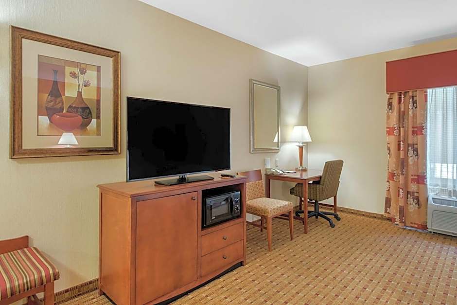A seating and sink area is featured. A lap desk and and a flat-screen plasma TV with sitting area.